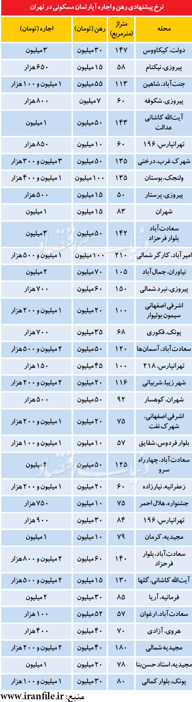 نرخ اجاره و رهن آپارتمان در تهران (جدول)