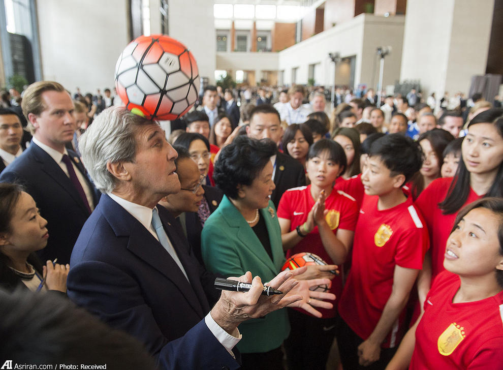 عصر ایران - جان کری وزیر امور خارجه آمریکا به همراه معاون نخست وزیر چین در بازدید از تیم فوتبال دانشگاهی زنان در موزه ملی چین در پکن در حال سر زنی با توپ فوتبال است. عکس :رویترز
