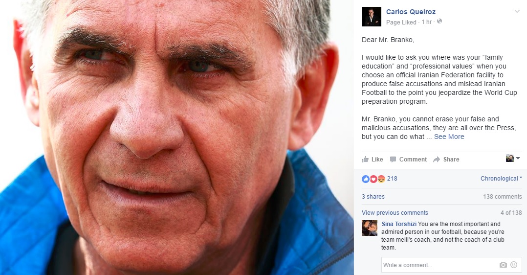 کارلوس کی روش باردیگر به برانکو ایوانکوویچ حمله کرد. سرمربی تیم ملی که در ماجرای تعطیلی اردوی ارمنستان تیم ملی همچنان از فدراسیون و سرمربی پرسپولیس ناراحت است پس از یک پست و یک مصاحبه دوباره یک پست تند علیه برانکو روی فیس بوک اش گذاشت.