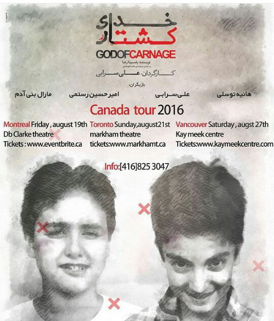 وی با تشکر از همراهیهای این دو بازیگر افزود: «خدای کشتار» در روزهای 19، 21 و 27 آگوست (29 و 31 مرداد و 6 شهریور)در شهرهای مونترال، تورنتو و ونکوور اجرا خواهد شد.