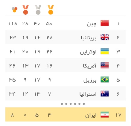 کاروان ایران با مدال های روز پنجم عملا 8 مدالی شد. 8 مدالی که 3 مدال اش طلایی است و پنج مدال اش نقره است. مدال های طلای ایران را ساره جوانمردی ، مجید فرزین و محمد خالوندی به دست آورده اند و نقره هارا : پاکباز ،قلعه، ناصری ،نعمتی و رنجبر ، سجاد محمدیان و عبدالله حیدری