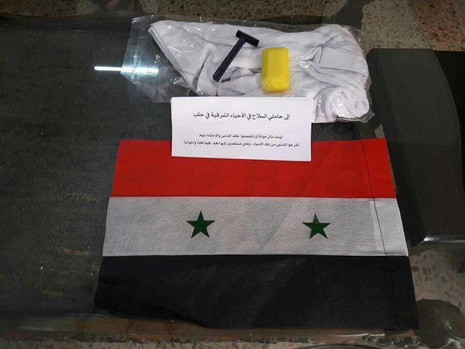 عصر ایران - هلی کوپترهای ارتش سوریه با انداختن بسته های پلاستیکی حاوی ریش تراش، صابون و حوله این پیام را به گروه های مسلح مخالف در مناطق شرقی حلب ارسال کرد: "این شرط مردانگی نیست که پشت غیرنظامیان سنگر بگیرید، اجازه دهید آنها خارج شوند. آنها خانواده ما هستند و در پناه مان خواهند بود."