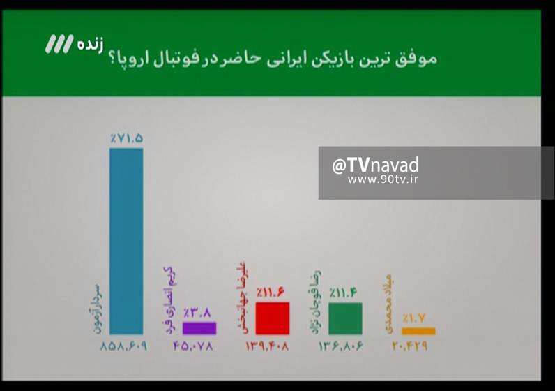 نظرسنجی این هفته نود در مورد عملکرد لژیونرهای ایران بود نظرسنجی ای که در پاسخ مردم تبدیل به انتخاب به عنوان محبوب ترین شد و در میان 5 گزینه حاضردر نظرسنجی بیش از 70 درصد به سردار آزمون به عنوان موفق ترین رای دادند. جوان اول فوتبال ایران که خیلی به لیگ برتری شدن اش امیدوارند.