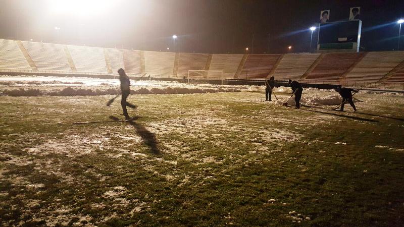 همانطور که در عکس می بینید حاضران در ورزشگاه مشغول پارو کردن برفی هستند که روی کاور مشمعی زمین چمن جمع شده است.