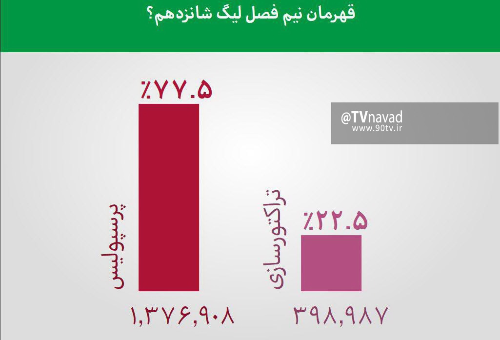 مخاطبان برنامه نود پرسپولیس را به عنوان قهرمان نیم فصل انتخاب کردند. به گزارش عصرایران و در جریان سوال پیامکی برنامه نود دوشنبه شب انتخاب قهرمان نیم فصل از میان تراکتورسازی و پرسپولیس به سوال گذاشته شده بود که بیش از 77 درصد به قهرمانی پرسپولیس و بیش از 22 درصد به قهرمانی تراکتورسازی در پایان نیم فصل یعنی دو هفته دیگر رای دادند.