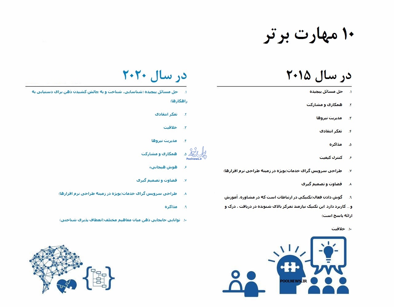 یک مقایسه ساده نشان می دهد در سال 2020 عامل خلاقیت که در سال 2015 در رده آخر قرار داشته به رتبه سوم آمده که این نشانگر اهمیت بالای این فاکتور برای موفقیت در آینده است. ربات ها می توانند به افزایش سرعت و کیفیت روند تولید و ارائه خدمات کمک کنند اما همچنان وظیفه ارائه خلاقیت و نوآوری برعهده ذهن انسان است. کافی است به باقی جابجایی ها نیز نگاهی دقیق تر داشته باشید همه چیز به خوبی گویای نیاز روز و آینده مشاغل در آینده نه چندان دور خواهد بود.