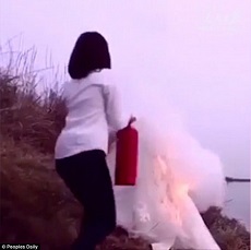 لباس عروسی شعلهور در آتش عکس بگیرد و به همین دلیل این تازه عروس چینی اقدام به آتش زدن لباس خود نمود.