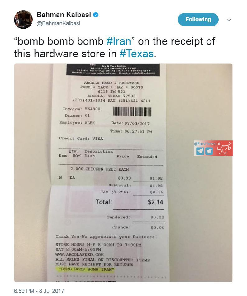 در انتهای رسید خرید مغازه ای در تگزاس آمریکا نوشته: «ایران را بمباران کنید»! به گفته خبرنگار بی بی سی، صاحب فروشگاه پس از دریافت تماس های متعدد، از مشتریان عذرخواهی کرده است.