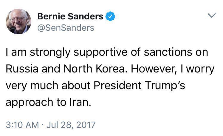 برني ساندرز: من قوياً از تحريم روسيه و كره شمالي حمايت مي كنم ولي از رويكرد ترامپ نسبت به ايران بسيار نگرانم.