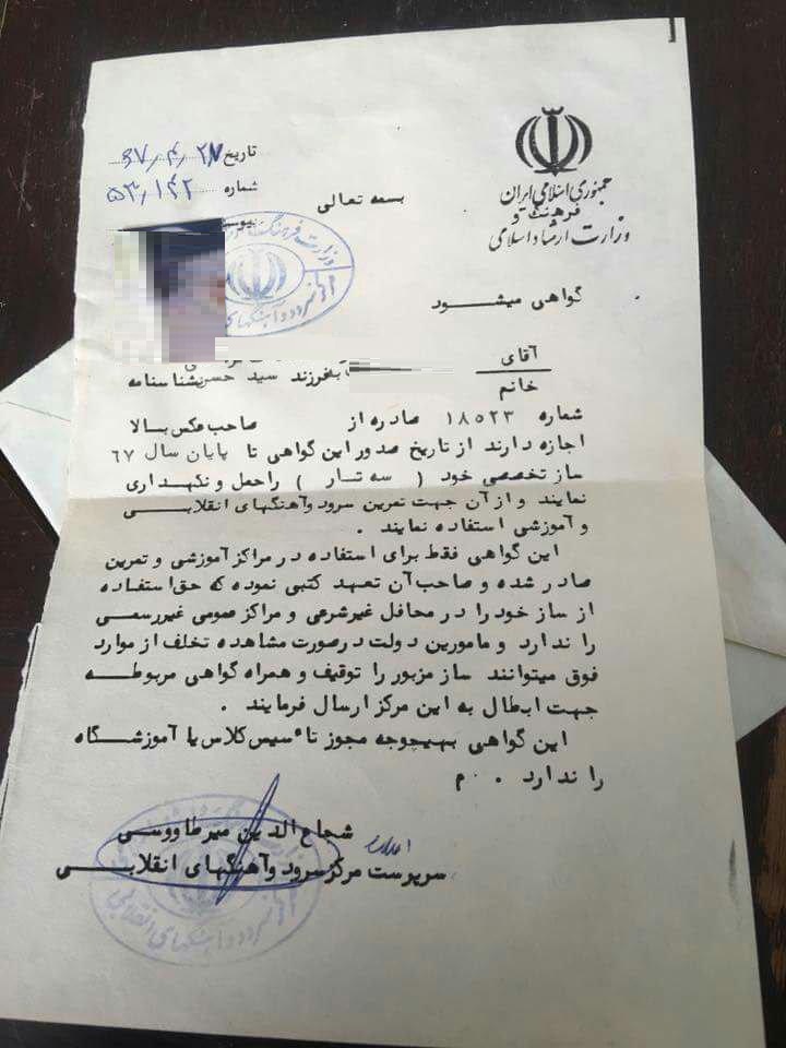 عصرایران - مجوز حمل ساز موسیقی (سه تار) در سال ۱۳۶۷