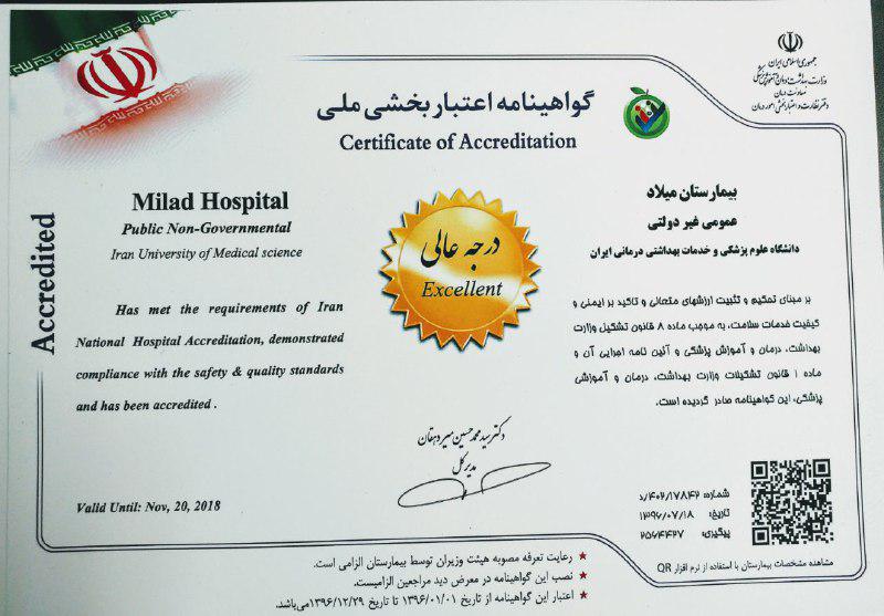 مدیر عامل بیمارستان میلاد ضمن تبریک کسب درجه عالی در ارزیابی اعتبار بخشی سال جاری وزارت بهداشت، گفت: بیمارستان های معدودی در کشور توانسته اند این درجه را کسب کنند که این مهم نشان دهنده بیمار محوری و ایمنی در بیمارستان است.