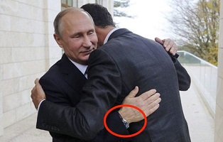 به گزارش ایسنا از ودوموستی، شبکه خبری سی ان ان در گزارشی در مورد دیدار ولادیمیر پوتین و بشار اسد در سوچی به ساعت رئیس جمهور روسیه پرداخته و آورده است: پوتین، بشار اسد را در دریای سیاه و گوشه بالکن محل اقامتش در رزیدانس باخاروف در سوچی که اتفاقا سرزمین مورد علاقه کرملین است چنان در آغوش می‌کشد که یکی از ساعتهای لوکس پوتین از زیر پیراهن نمایان می‌شود.