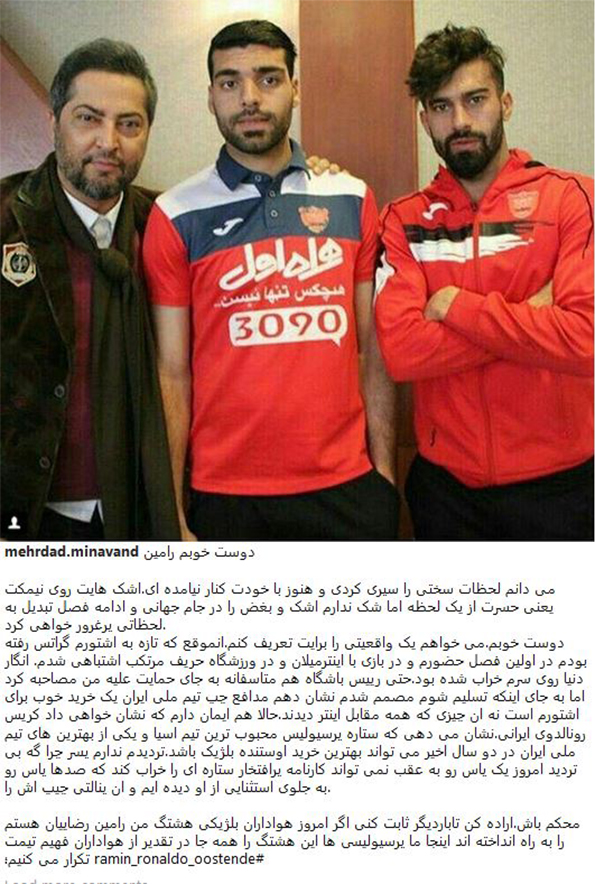 مهرداد میناوند با انتشار عکسی در اینستاگرامش،برای رامین رضاییان که در یک مسابقه باعث شکست خوردن تیمش شده بود نوشت: