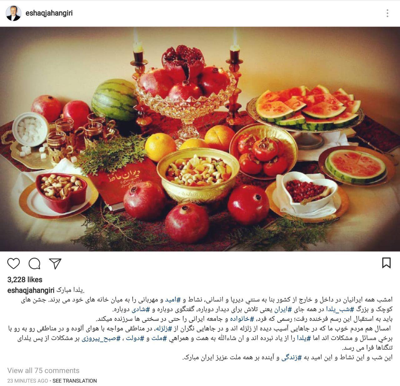 پست اینستاگرامی جهانگیری به مناسبت شب یلدا (عکس)