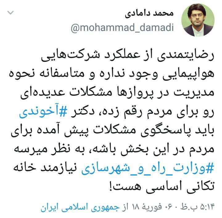 محمد دامادی، نماینده مردم ساری در مجلس شورای اسلامی با انتشار توئیتی خواهان خانه تکانی اساسی در وزارت راه شد.