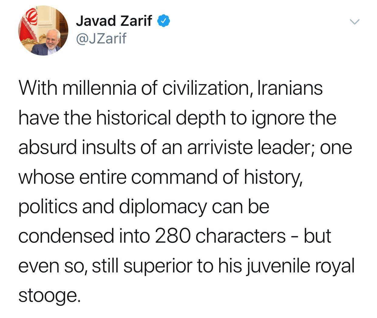 وزیر امورخارجه ایران در یک پیام توئیتری نوشت: ایرانیها با تمدن هزاران ساله صاحب چنان ریشههای تاریخی هستند که فحاشیهای یک رهبر تازهکار را نادیده میگیرند؛ کسی که کل تسلطش بر تاریخ، سیاست و دیپلماسی را میتوان در ۲۸۰ کلمه (به اندازه یک پیام توئیتری) خلاصه کرد.