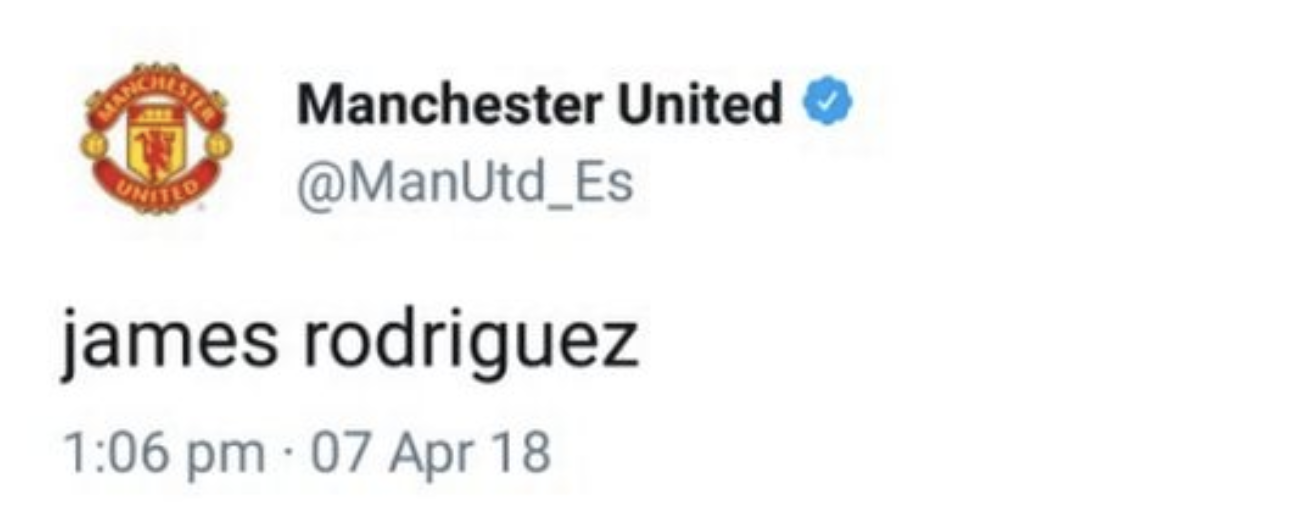 به گزارش "ورزش سه"، در جریان دربی این هفته یونایتد برابر سیتی، حساب توئیتر باشگاه یونایتد در حین گزارش لحظه به لحظه مسابقه، برای دقایقی نام خامس رودریگز، ستاره کلمبیایی رئال مادرید که در حال حاضر به شکل قرضی در بایرن مونیخ بازی می کند را پست کرد.
