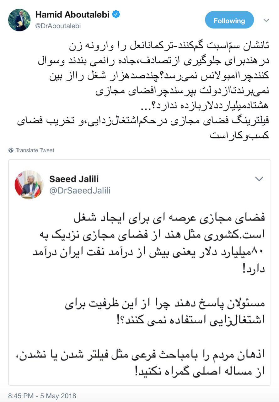 حمید ابوطالبی مشاور رئیس‌جمهور در واکنش به توئیت سعید جلیلی نوشت: صدهزار شغل را از بین نمی‌برند تا از دولت بپرسند چرا فضای مجازی هشتاد میلیارد دلار بازده ندارد.