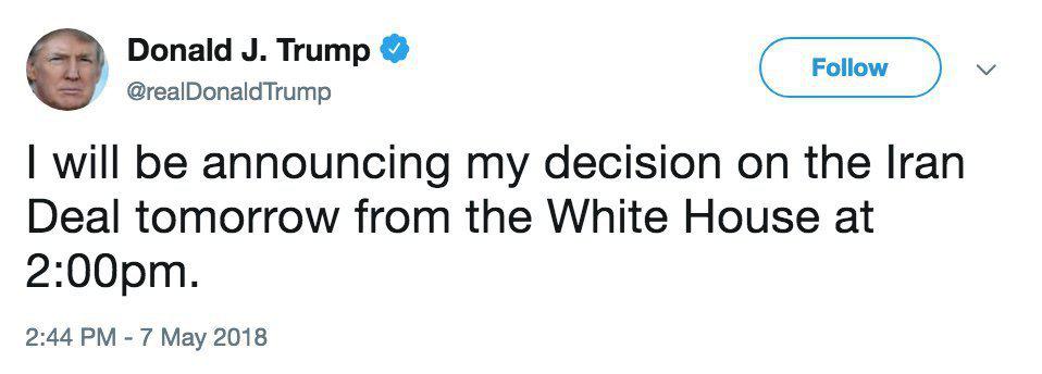 ترامپ در توییتی نوشت، تصمیمش در مورد برجام را فردا سه شنبه ساعت ۱۴ (۲۲:۳۰ به وقت تهران)، اعلام خواهد کرد