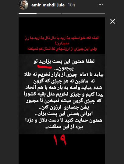 امیر مهدی ژوله با انتشار پیام علی کریمی در استوری اینستاگرامش نوشت: البته اگه خواستید بذارید با دال رال بذارید، با رِزِ نمیذارن! ولی این چیزی از ارزش های گذاشتن کم نمی کنه!