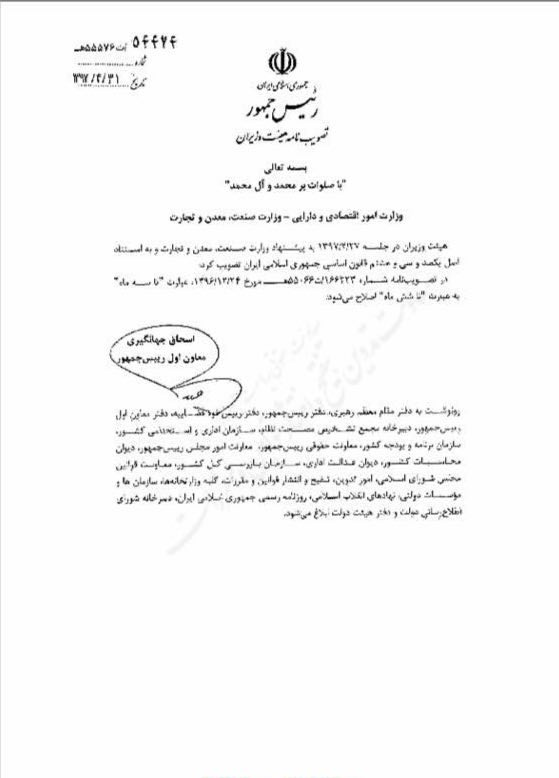 هیئت وزیران در جلسه ۱۳۹۷.۴.۲۷ به پیشنهاد وزارت صنعت، معدن و تجارت و به استناد اصل یکصد و سی و هشتم قانون اساسی جمهوری اسلام ایران تصویب کرد: