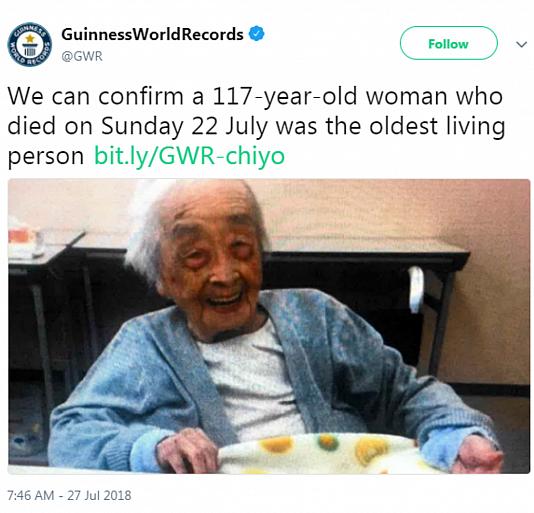 پایگاه اینترنتی رکورد‌های جهانی گینس روز جمعه با انتشار عکسی از چیو میاکو خبر درگذشت او را منتشر کرد. این زن ژاپنی در روز دوم ماه مه سال ۱۹۰۱ میلادی به دنیا آمده بود. او تا هنگام مرگ ۱۱۷ سال و ۸۱ روز زندگی کرده بود.