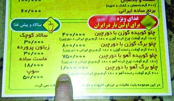 چلوکوبیده گوزن با دورچین ۴۰هزار تومان، چلوبرگ گوزن با دورچین ۸۰هزار تومان، چلوکوبیده آهو ۷۵هزار تومان و چلوبرگ آهو با دورچین ۱۰۰هزار تومان!