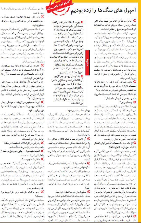 - بله در اینکه سگ قلاده نداشت و اشتباه من بود هیچ حرفی ندارم. من عذرخواهی هم کردم ولی می‌گویم آن پارک گیت و نگهبان دارد و پنج ماه است که سگ‌هایم را آنجا می‌برم. نگهبان می‌دید سگ‌هایم را آنجا می‌بردم و چیزی نمی‌گفتند. حتی آن پارک یک تابلو و نشانه نداشت که ورود سگ ممنوع است. اگر نگهبان می‌گفت اجازه نداریم سگ را به پارک بیاوریم قطعا این کار را نمی‌کردیم.