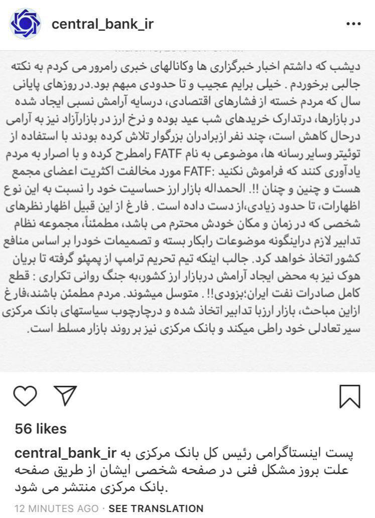 این پست به نقل از همتی در صفحه اینستاگرام بانک مرکزی منتشر شد.