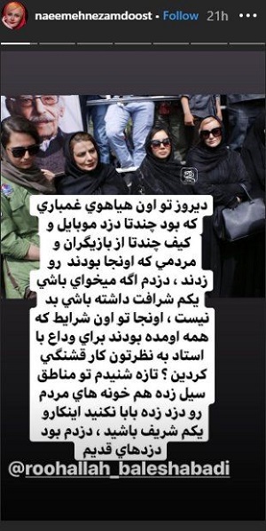 نعیمه نظام دوست بازیگر سینما و تلویزیون با انتشار متنی در استوری اینستاگرام، درباره سرقت از بازیگران در مراسم تشییع پیکر جمشید مشایخی نوشت: «تو اون هیاهوی غمباری که بود، چند تا دزد موبایل و کیف چند تا از بازیگران و مردمی که اونجا بودند رو زدن. دزدم اگه میخوای باشی یکم شرافت داشته باشی بد نیست. اونجا تو اون شرایط که همه اومده بودن برای وداع با استاد به نظرتون کار قشنگی کردین؟