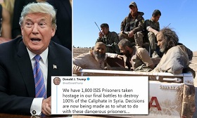 به گزارش ایسنا، به نوشته روزنامه دیلی میل، دونالد ترامپ، رئیسجمهوری آمریکا در پیام توییتری نوشت: ۱۸۰۰ زندانی داعشی داریم که در نبردهای پایانی ما برای تخریب ۱۰۰ درصدی این خلافت در سوریه گرفتیم. اکنون باید تصمیمگیری شود که با این زندانیان خطرناک چه شود.
