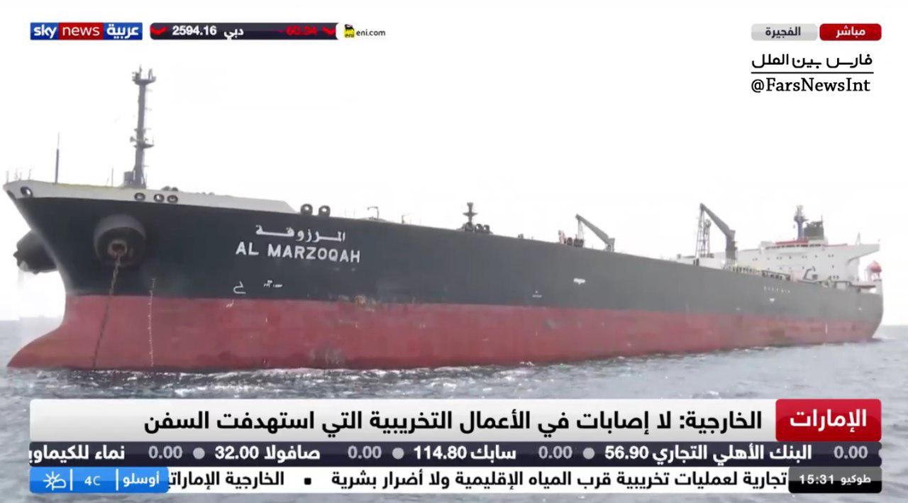 شبکه اسکای‌نیوز تصویری از کشتی نفتکش «المرزوقه» به نمایش گذاشت که در حادثه فجیره آسیب دیده است.آسیب وارد شده به کشتی در تصویر مشخص نیست.