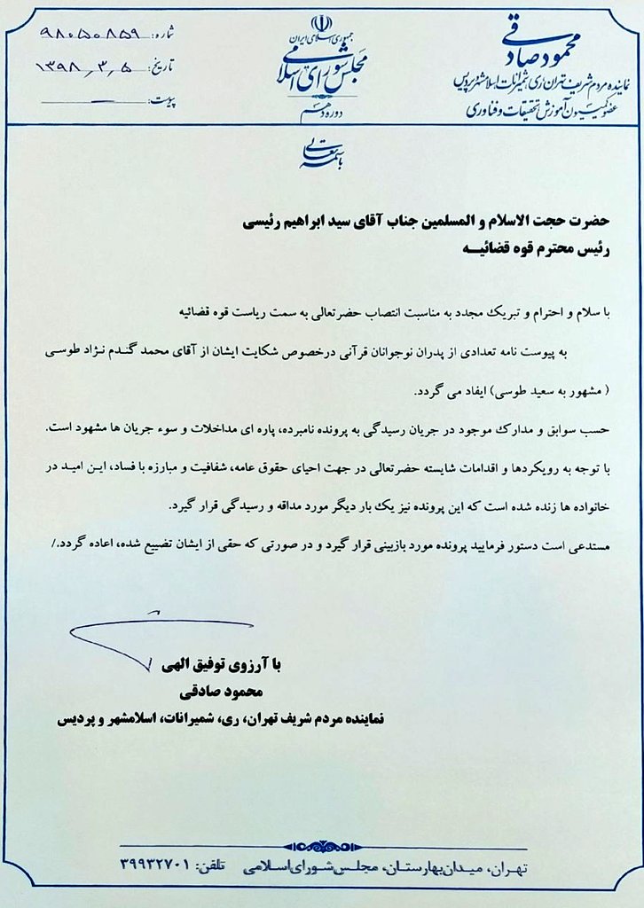 «پیرو درخواست تعدادی از پدران نوجوانان قرآنی و باتوجه به رویکردهای امیدبخش رییس محترم قوه قضاییه، از ایشان درخواست کردم دستور دهند پرونده ی مربی صوت و لحن مورد بازبینی و رسیدگی مجدد قرار گیرد».