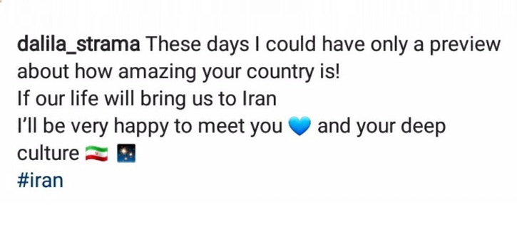 با این حال همسر استراماچونی امروز با انتشار پست اینستاگرامی نشان داد که مشکلی برای حضور در ایران ندارد. او در آخرین پست اینستاگرامی اش از اینکه ایران یک کشور شگفت انگیز است نوشته و گفته درباره ایران حقیقاتی انجام داده که منجر به آشنایی بهتر او با ایران شده است.او در این پست می نویسد:اگر زندگی قرار است ما را به ایران بیاورد ، خیلی خوشحال می شوم با شما و فرهنگ عمیقتان آشنا بشوم.