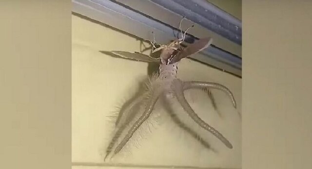 به گزارش ایسنا، در این ویدیو موجودی با اندازه‌ای متوسط با دو بال و چهار شاخک به طول‌های مختلف در حال بالا رفتن از سقف اتاق دیده می‌شود.