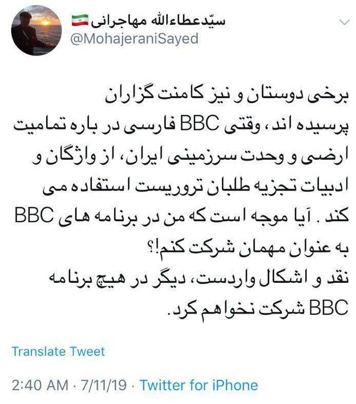 عطاالله مهاجرانی: دیگر در هیچ برنامه BBC شرکت نخواهم کرد
