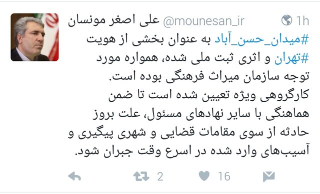 به گزارش ایسنا، علیاصغر مونسان در صفحه شخصی خود در توئیتر نوشت: «میدان حسنآباد به عنوان بخشی از هویت تهران و اثری ثبت ملی شده، همواره مورد توجه سازمان میراث فرهنگی بوده است.