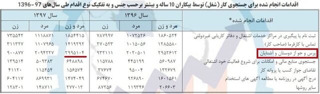 با توجه به تعداد سه میلیون و ۲۶۰ هزار و ۷۹۶ نفری بیکاران در سال گذشته به طور متوسط هر بیکار از سه راه دنبال کار می‌گردد.نکته قابل توجه اینکه در سال ۱۳۹۶ نیز چهار روش به عنوان عمده‌ترین اقدامات صورت گرفته برای یافتن شغل از سوی بیکاران اعلام شده بود که از بین اقدامات صورت گرفته توسط بیکاران به ترتیب سهم تماس با کارفرما ۱.۱ درصد، جستجوی منابع مالی و امکانات برای شروع فعالیت خود اشتغالی ۰.۸ درصد، پرس و جو از دوستان و آشنایان ۰.۸ درصد، سایر روشها ۰.۷ درصد و تقاضای جواز کسب یا پروانه کار ۰.۲ درصد افزایش داشته و در مقابل پرس و جو از دوستان و آشنایان ۰.۴ درصد، ثبت‌نام یا پیگیری در دفاتر کاریابی غیردولتی ۰.۶ درصد و درج آگهی در روزنامه یا پیگیری آگهی‌های استخدامی ۱.۹ درصد کاهش داشته است.