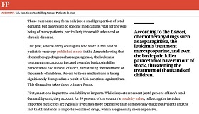 به گزارش ایسنا، محمدجواد ظریف، وزیر امور خارجه کشورمان در توییتی نوشت: لازم نیست تنها از من بشنوید. فارین پالیسی در گزارشی به تاثیرات تروریسم اقتصادی دولت دونالد ترامپ بر روی ایرانیان پرداخته و شرح داده که این تحریم‌ها بر افرادی که به تولید دارو برای بیماران سرطانی مشغول هستند، تاثیر مستقیم گذاشته‌اند.