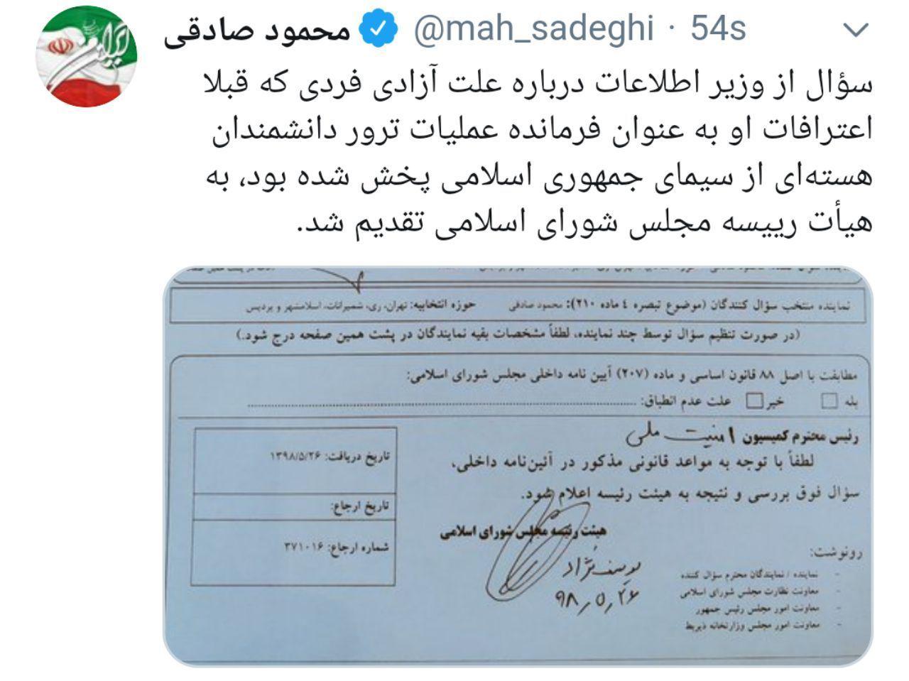 سئوال محمود صادقی نماینده تهران از وزیر اطلاعات درباره علت آزادی فرمانده عملیات ترور دانشمندان هسته‌ای