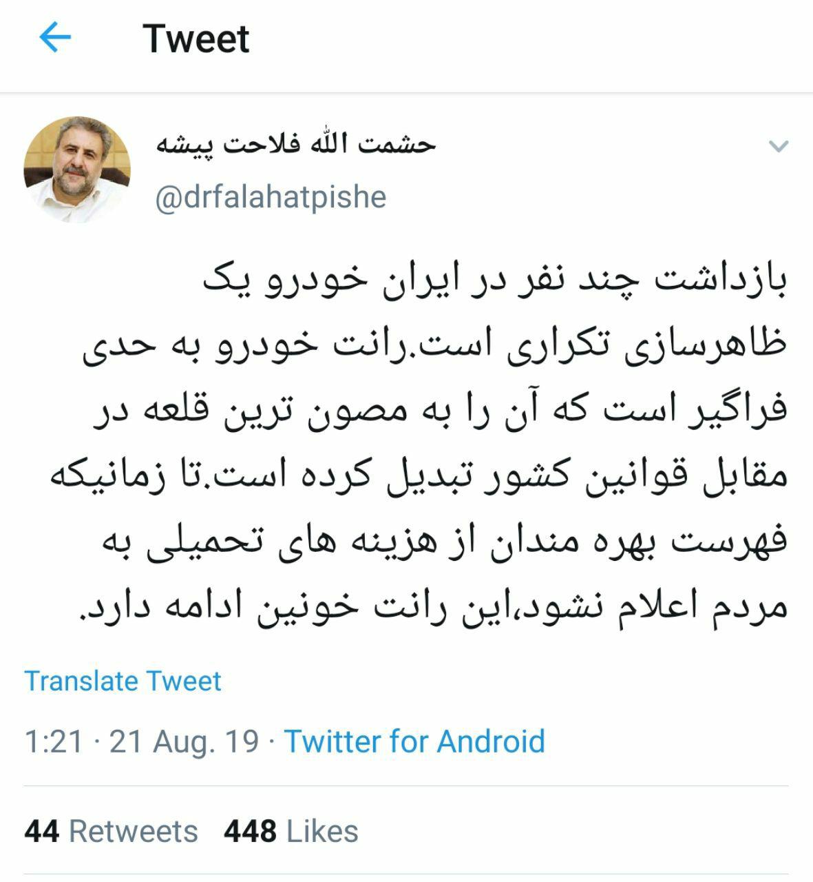به گزارش ایسنا حشمت الله فلاحت پیشه در مطلبی در صفحه شخصی خود در توییتر نوشت: «بازداشت چند نفر در ایران خودرو یک ظاهرسازی تکراری است. رانت خودرو به حدی فراگیر است که آن را به مصون‌ترین قلعه در مقابل قوانین کشور تبدیل کرده است. تا زمانی که فهرست بهره‌مندان از هزینه‌های تحمیلی به مردم اعلام نشود، این رانت خونین ادامه دارد.»