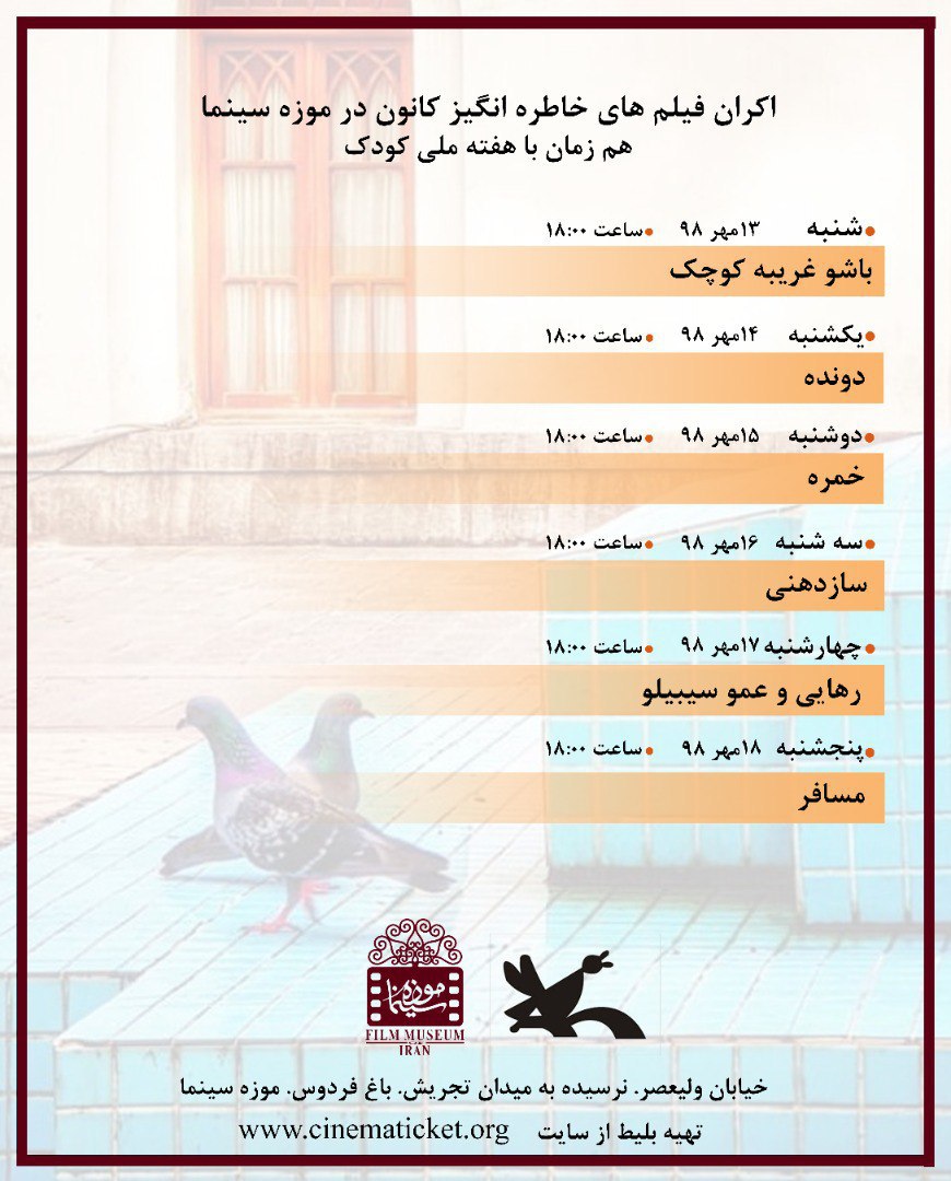 فیلمهای «باشو غریبه کوچک» شنبه ۱۳ مهرماه، «دونده» یکشنبه ۱۴ مهرماه، «خمره» دوشنبه ۱۵ مهرماه، «ساز دهنی» سهشنبه ۱۶ مهرماه، «رهایی» چهارشنبه ۱۷ مهرماه، «عمو سیبیلو» چهارشنبه ۱۷ مهرماه و «مسافر» پنجشنبه ۱۸ مهرماه در موزه سینما به نمایش در میآید.