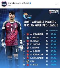 به گزارش ایسنا، سایت ترانسفر مارکت در صفحهی خود در فضای مجازی ۱۰بازیکن با ارزش و گرانقیمت لیگ ایران را منتشر کرد که بر این اساس، علیرضا بیرانوند با ۳.۵ میلیون یورو گران ترین بازیکن لیگ ایران لقب گرفت و بعد از او شیخ دیاباته و مهدی ترابی به ترتیب با ۳ و ۱.۵ میلیون یورو در رتبه بعدی قرار دارند.