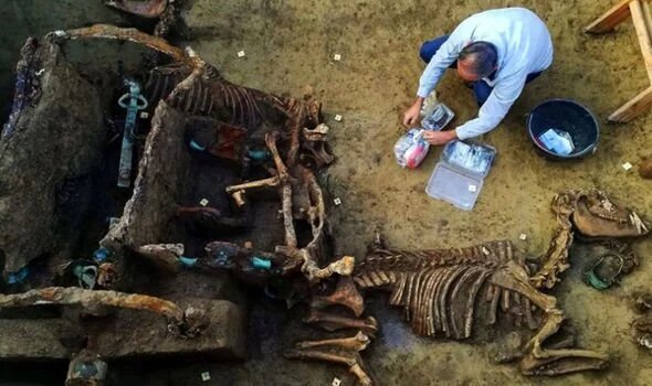 باستانشناسان بقایای این ارابه و فسیلهای اسب را درحالی که در یک مقبره بزرگ قرار داشتند، کشف کردند.