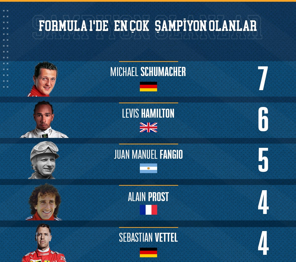 این راننده انگلیس با قهرمانی در فرمول یک قهرمانی جهان در سال 2019 برای ششمین بار یه این عنوان معتبر دست یافت و با روند تنها یک قهرمانی با رکورد اسطوره فرمول یک جهان میشایل شوماخر که با 7 قهرمانی در صدر دیده می‌شود، فاصله دارد.خوان مانوئل فنگیو سوم، آلن پروست از فرانسه با 4 قهرمانی در مکان چهارم و سباستین فتل آلمانی با 4 قهرمانی پنجم است.