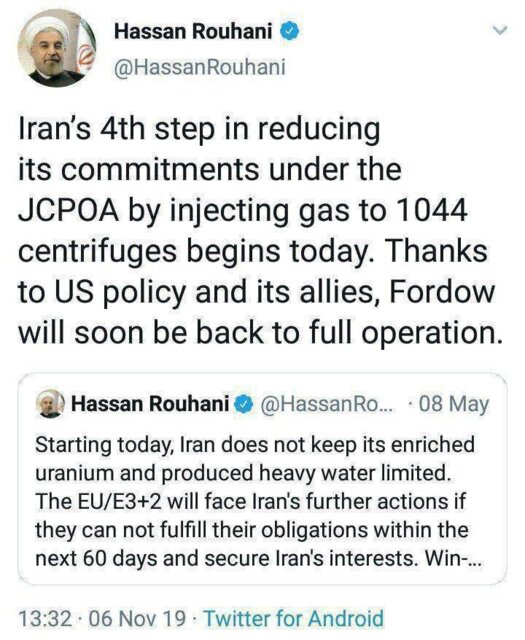 به گزارش ایسنا، متن یادداشت توییتری رییس جمهور به این شرح است :امروز چهارمین گام ایران برای کاهش تعهدات برجامی‌اش با گازدهی به 1044 سانتریفیوژ آعاز می‌شود. به خاطر سیاست‌های آمریکا و متحدانش، سایت فردو به زودی به طور کامل فعالیت می‌کند.
