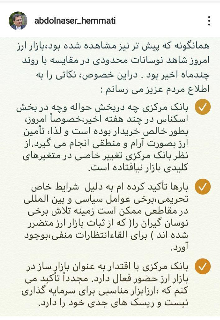رییس کل بانک مرکزی اظهار داشت: ارز ابزار مناسبی برای سرمایه گذاری نیست و ریسک‌های جدی خود را دارد. به گزارش ایلنا، عبدالناصر همتی در پست اینستاگرامی خود نوشت: