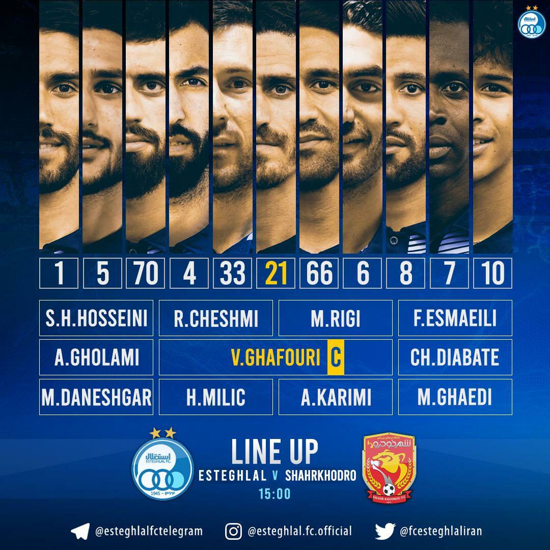 به گزارش ایسنا، با نظر آندره‌آ استراماچونی، سید حسین حسینی، محمد دانشگر، روزبه چشمی، عارف غلامی، وریا غفوری، مسعود ریگی، علی کریمی، میلیچ، فرشید اسماعیلی، مهدی قائدی و شیخ دیاباته برای دیدار با شهرخودرو به میدان می‌روند.