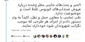 شهردار تهران در پیامی توئیتری از صدور دستوراتی مبنی بر عدم اجرای طرح فروش صندلی اتوبوس ها خبر داد.