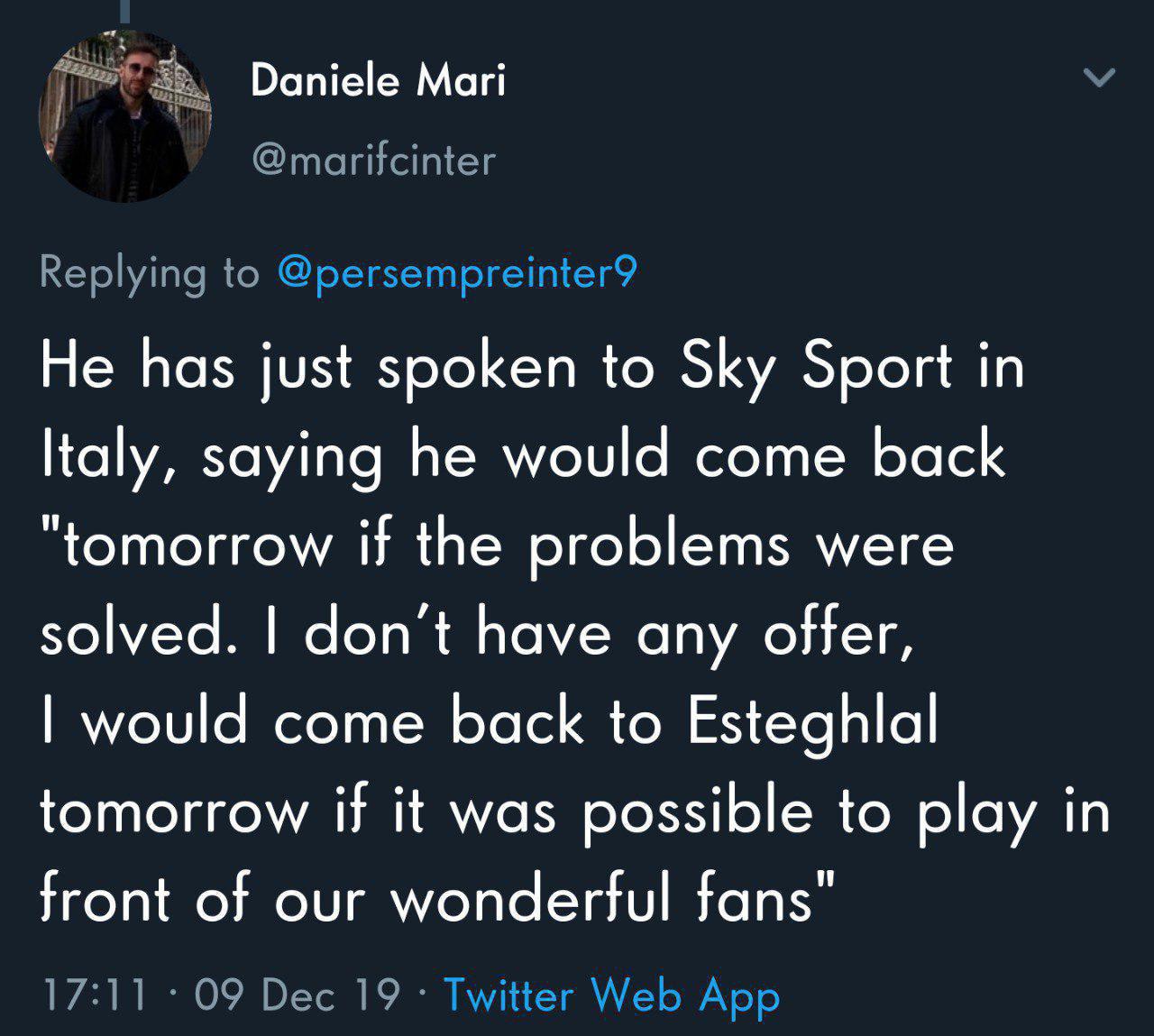 به گزارش جماران؛ استراماچونی در مصاحبه با اسکای گفت: اگر تا فردا مشکلاتم با استقلال حل شود به این تیم برمیگردم. پیشنهاد دیگری ندارم و اگر ممکن باشد فردا میتوانم برگردم تا در مقابل هواداران فوق العادمان بازی کنیم.